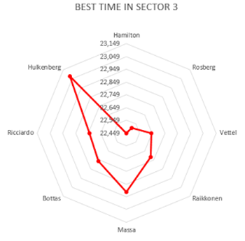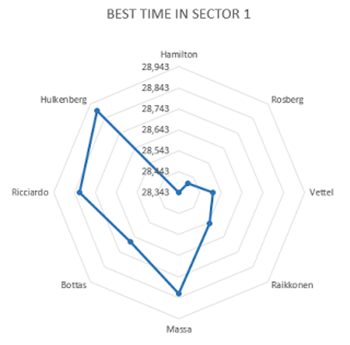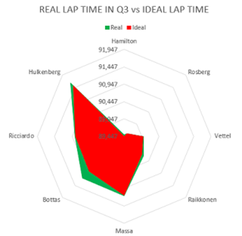 Diamo ora un’occhiata al grafico in cui viene riportato il tempo segnato nel Q3 contro il tempo ideale, dato dalla somma dei migliori settori. L’unico pilota ad aver ottenuto il massimo in Q3 è stato Rosberg, mentre i suoi avversari seppur in generale con distacchi minimi non ci sono riusciti.