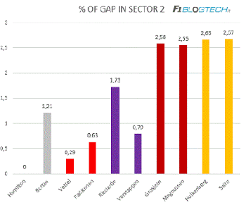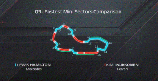 Passiamo ora all’analisi vera e propria dei distacchi percentuali e delle velocità massime nei tre settori del circuito. Questa volta la FOM oltre ai tempi nei settori, ha fornito una mappa con la divisione della pista in mini settori, nella quale viene riportato chi sia stato il più veloce nel confronto tra Hamilton (azzurro) e Raikkonen (rosso).