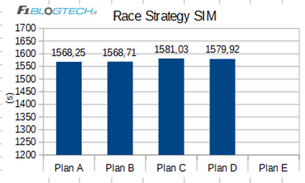 Fin dalle simulazioni di gara del venerdì, la strategia piú veloce sembrava essere quella ad un solo pit-stop in cui si partiva con la US, gomma usata nella Q2, e si cambiava mescola al 21° passaggio passando alla gomma Soft. Altre strategie, come quella provata dalla RedBull, SS-S, erano di alcuni secondi più lente, ma nel caso del team inglese non sono risultate efficaci per via del traffico.