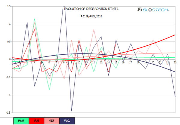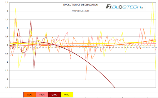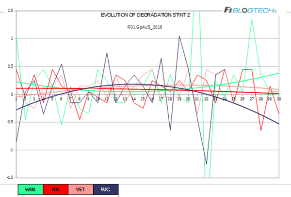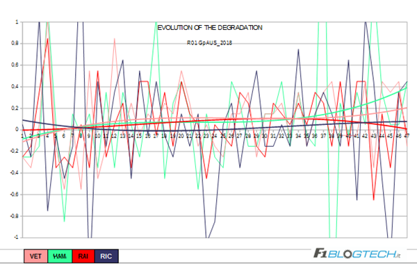 Qui è invece analizzata l’evoluzione del degrado durante la gara. I valori nel grafico sono il gap in secondi tra un giro e il suo precedente.