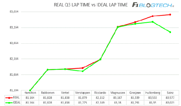 Confronto tra i tempi segnati nel Q3 e i tempi ideali dati dalla somma dei migliori crono nei tre settori del circuito.