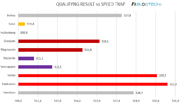 Il grafico con il confronto tra le velocità massime e il risultato in qualifica ci fornisce i primi fondamentali elementi di analisi. In primis si può notare che le Ferrari sono risultate le più veloci, a conferma del tanto discusso alleggerimento aerodinamico attuato dalla casa di Maranello.
