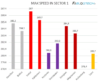 Il primo settore è quello più veloce, che predilige una buona efficienza in rettilineo (intesa come connubio tra potenza della PU e cx ), ma richiede anche dei buoni sforzi di trazione per la sequenza di curva 3/4/5.