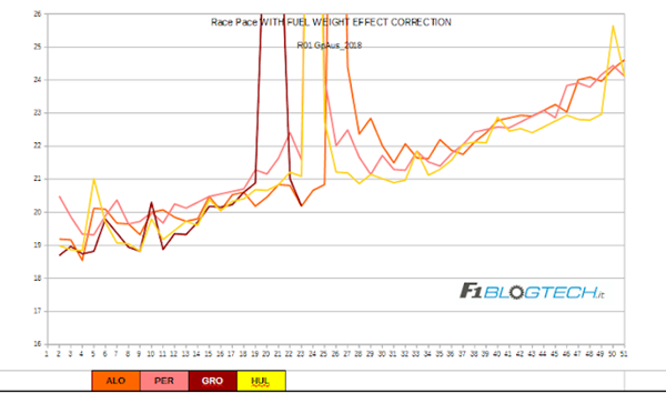 Passo gara (Alonso, Perez, Grosjean e Hulkenberg) con la correzione dell’effetto peso dovuto al consumo di carburante. Correzione effettuata con dati magneti marelli 2017 (praticamente corrispondente ai dati 2018).