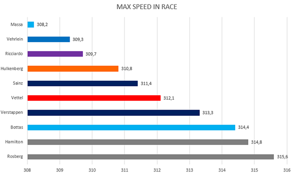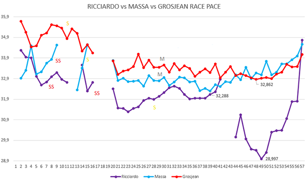 Molto male la Williams con un passo gara simile alla nuova arrivata Haas (che ha centrato la miglior strategia di gara), mentre da notare il terzo stint della Red Bull con Ricciardo (che ha battuto di 3,5 secondi il giro più veloce in gara registrato nel 2014!).