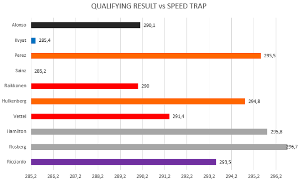 Guardando invece il grafico in cui viene messa a confronto la velocità alla speed trap con la posizione in qualifica, possiamo trarre diverse conclusioni che ci confermeranno anche i dati sui settori (anche se comunque quello di Montecarlo è un rilevamento un po’ anomalo): in primis notiamo una Red Bull che finalmente si pone a livello degli avversari anche nei rettilinei, dopo gli aggiornamenti portati da Renault, poi una Ferrari e una Force India un pò meno efficienti sul rispetto al solito, chiaramente per necessità di downforce, e infine vediamo che Toro Rosso soffre sempre tantissimo a causa di una PU datata.