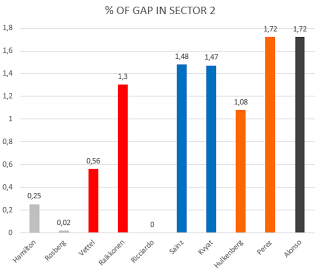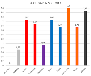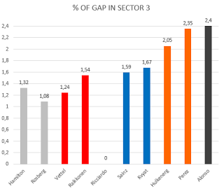Questa volta però non più con i grafici a radar che vi ho sempre proposto fino ad adesso, ma con dei più intuitivi istogrammi. Inoltre al posto dei tempi nei vari settori, per rendere più reale ma anche più semplice l’analisi, prenderemo in esame i distacchi percentuali dei vari piloti in ogni settore.