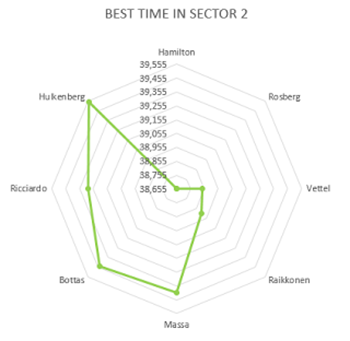 Guardando il grafico in cui viene messo a confronto il tempo reale in Q3 con il giro “ideale” (dato dalla somma dei migliori intertempi), notiamo intanto che quasi tutti i piloti entrati in Q3 sono riusciti ad ottenere la performance migliore proprio quando più serviva, con differenze minime per Rosberg, Ricciardo e Verstappen, mentre invece Sainz avrebbe potuto sopravanzare il compagno di squadra.
