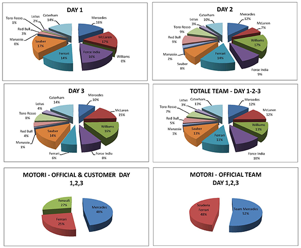 Tra i motoristi si mette nuovamente in evidenza la Mercedes che con i suoi quattro partners (Mercedes, McLaren, Williams e Force India) vince il duello con la bellezza di 1144 giri totali. La Williams, oggi in pista con il neo-collaudatore Nasr, copre il 18% dei giri totali (87 passaggi) fissando la quarta miglior prestazioni. Lo staff di Frank Williams saluta il tracciato di Sakhir con 318 giri, contro i 315 di Mercedes, i 299 di McLaren e i 212 della coppia Hulkenberg-Perez. Causa i problemi di Sauber e, soprattutto, Marussia il propulsore di Maranello non va oltre le 552 tornate.