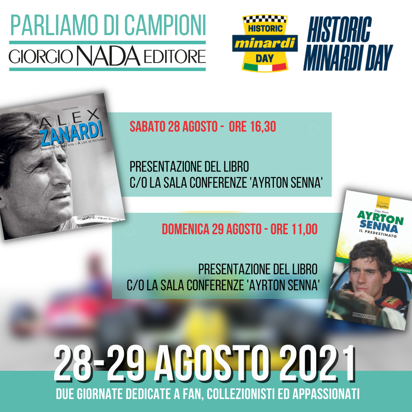 Nelle due giornate non mancheranno gli appuntamenti culturali con le presentazioni presso la Sala Briefing: sabato 28 alle 10:00 Bucci Composites presenterà ai media il suo cerchio in carbonio da 22”, sviluppato in esclusiva per la Bentley Bentayga il primo ad aver superato il test TUV, (aperti al pubblico) ore 12:00 Alessandro Silva in collaborazione con Scuderia Tazio Nuvolari presenterà “Formula Junior made in Italy”, ore 14:30 Sergio Lancieri presenta il suo libro “Perché il karting”, ore 15:30 Renata Nosetto presenta il libro “Giù la visiera e piede a tavoletta” e alle ore 16:30 Giorgio Nada Editore Presenta il libro “ALEX ZANARDI immagini di una vita / A life in pictures” di Mario Donnini, in compagnia proprio della firma di Autosprint. Domenica 29 alle 10:00 appuntamento con Re-Evolution Day, alle ore 11:00 Giorgio Nada Editore presenta il libro “AYRTON SENNA il predestinato” di Diego Alvera’, ore 12:00 la conferenza “Esport e Sim racing: competizioni e business”