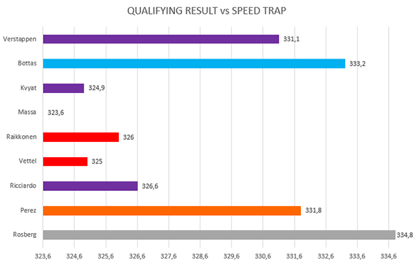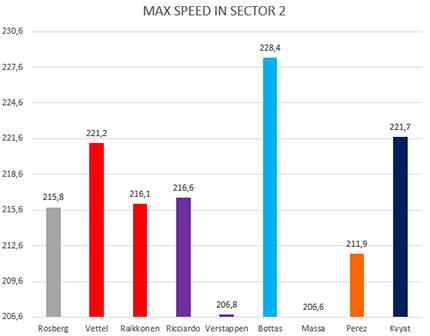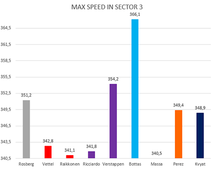 Passando al grafico sulle velocità massime registrate alla speed trap possiamo notare che come al solito al top troviamo i motorizzati Mercedes, seguiti abbastanza da vicino da Verstappen.