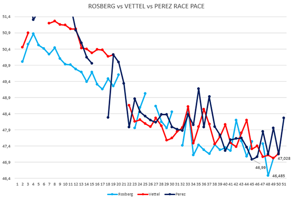 Visti i dati molto strani e di difficile interpretazione, ma anche tenuto conto della diversa performance in gara su una pista più calda, risulta abbastanza ovvio (chiaramente solo per noi che siamo “fuori”) ricercare le cause di questa performance in un non corretto utilizzo degli pneumatici.