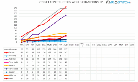 Al contrario, mentre Ferrari è “ferma” a ritrovare il bilancio della vettura, Mercedes, dopo qualche leggero aggiornamento in Spagna, ha fatto un grande step motoristico in Francia, migliorando gli sforzi di trazione (per i quali aveva tanto perso in Canada) e appaiandosi a Ferrari in quanto a velocità in rettilineo.