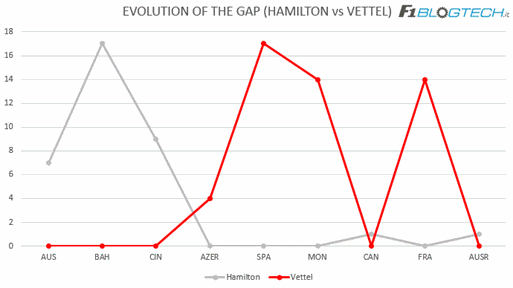 Propongo anche un interessante grafico con l’evoluzione del distacco fra i due contendenti al titolo, che evidenzia perfettamente quanto sia aperto questo mondiale dopo 9 gare.