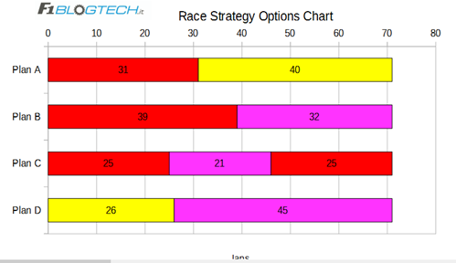 Per cui, tutti i team si sono orientati senza dubbi su una gara ad un unico stop. Visto il delta ristretto tra la gomma US e SS, ai team rimaneva da decidere con che gomma partire. Ferrari ha deciso di partire con la più morbida del lotto, la US, per avere il massimo grip disponibile alla partenza. Mercedes ha optato invece per la SS, come la RedBull, al fine di andare più lunghi nel primo stint e sfruttare magari una Safaty Car o una Virtual per effettuare il pit.
