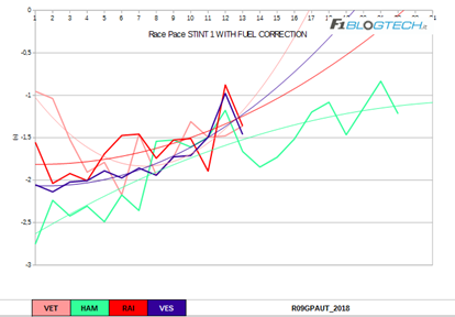 Per l’analisi del primo stint prendiamo in considerazione il grafico dei passi gara con la correzione dell’effetto peso. Hamilton sulla SS ha comunqnue tenuto un ritmo molto buono, come sottolineato in precedenza.