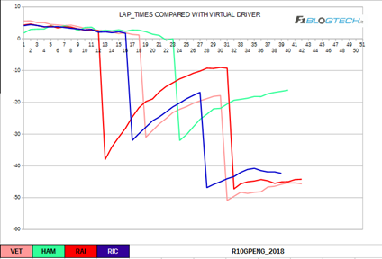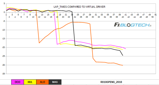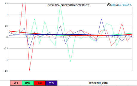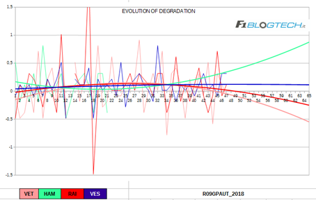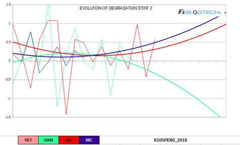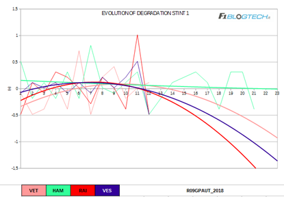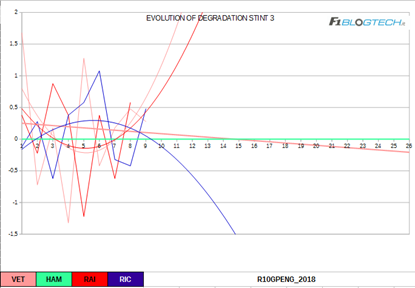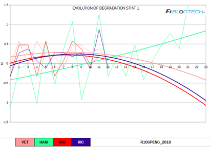 Il grafico dell’evoluzione del degrado ci offre un’interessante riflessione per quanto riguarda il fenomeno del blistering che molte vetture hanno accusato nel secondo stint.