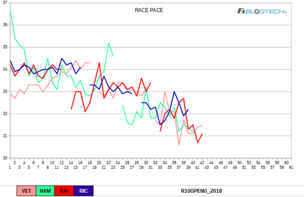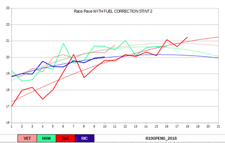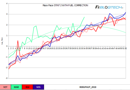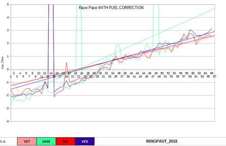 Anche per il secondo stint analizziamo in grafico relativo ai passi gara con la correzione del fuel weight effect. Si nota subito un Hamilton che, come detto, nella prima parte dello stint non è riuscito a trovare il ritmo con la gomma Soft.