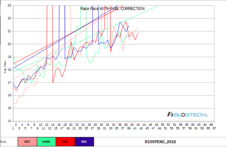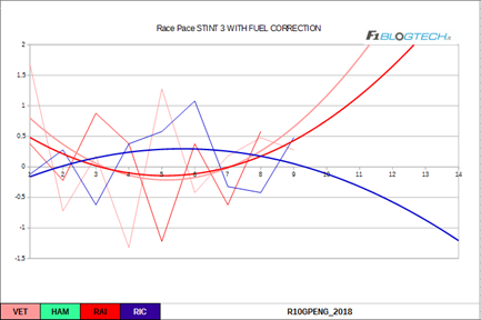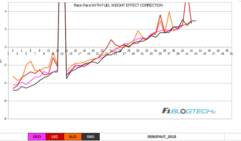 Continuando l’analisi dei passi gara, proponiamo il grafico dei passi gara con il calcolo dell’effetto peso, ossia la perdita di peso della vettura a causa del consumo di carburante.