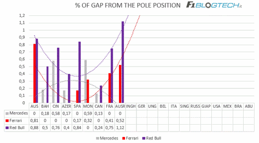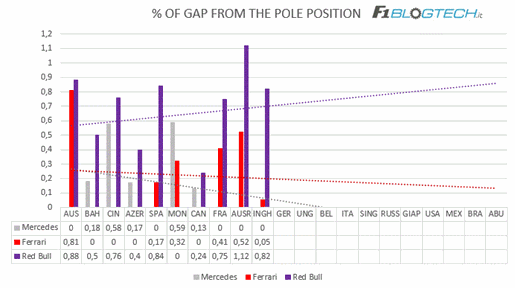 Analizzando le linee di tendenza (polinomiali) del grafico in cui viene riportato il distacco percentuale dalla pole position, possiamo cogliere un primo interessante elemento di analisi.