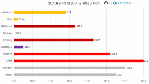Il grafico con il confronto tra le velocità massime registrate alla speed trap e la posizione di qualifica, ci conferma la maggior importanza dell’efficienza in rettilineo rispetto a quella in curva sul Red Bull ring, ma ci conferma anche l’appaiamento in quanto a top speed tra Mercedes e Ferrari.