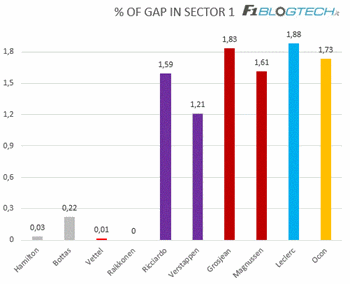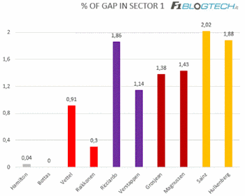 Analizzando in primis il grafico con il confronto tra il tempo segnato nel Q3 e il tempo “ideale” dato dalla somma dei migliori settori, notiamo che Ricciardo e Hulkenberg sono gli unici piloti che si sarebbero potuti migliorare di qualche decimo.