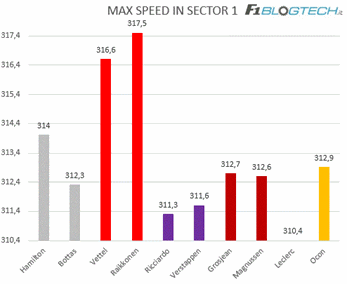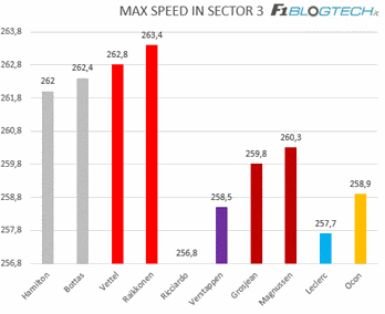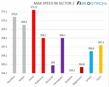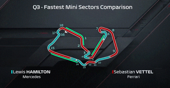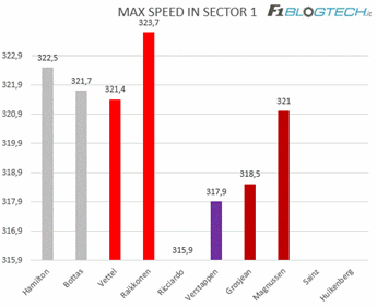 Nel primo settore a farla da padrone sono le Mercedes grazie ad una maggiore precisione nell’inserimento di curva uno, dove Vettel ha commesso anche un piccolo errore, perdendo 10km/h in uscita.