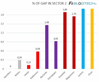 Prendendo in analisi Vettel, il distacco in termini cronometrici è di 0,238 secondi, che divisi per le 4 curve del terzo settore, significano che ad ogni curva Sebastian ha perso 0,060s.