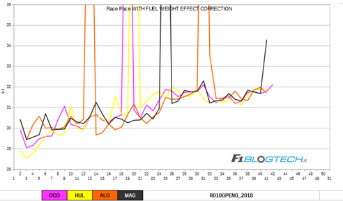 Il grafico del passo gara con la correzione dell’effetto peso ci fa notare che tutti questi piloti hanno usufruito della VSC del 14° giro provocata dallo stop di Bottas. Grosjean, Alonso e Ocon hanno pittato sotto regime di VSC e poi hanno gestito la gomma per arrivare fino in fondo alla gara. Nel primo stint Leclerc ha fatto un errore in curva sette, ma poi ha fatto un buonissimo lavoro nel secondo stint nel gestire la mescola Soft. Il suo compagno di squadra non ha usufruito della VSC, ma ha allungato lo stint e poi è finito dietro al pilota del Principato.