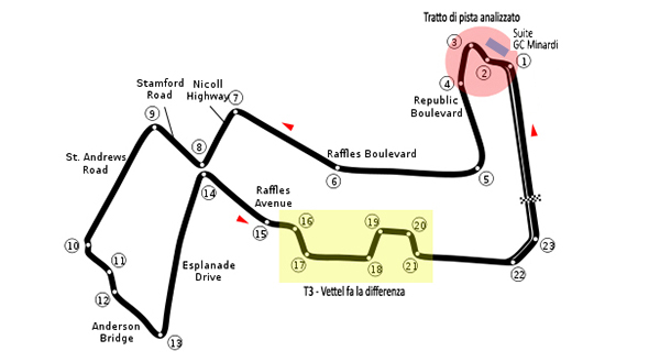 DUBBIO 1: dalla mia suite, per osservare e confrontare lo stile di guida tra i vari piloti, avevo preso dei punti fissi di riferimento della pista come i “panettoni” posti all’interno della curva che immette su Republic Boulevard per non far tagliare il cordolo. In quel punto mi ha colpito la guida pulitissima di Vettel. Era in grado di percorrere tutto quel tratto di pista senza effettuare nessuna correzione, diversamente da tutti i suoi avversari (compagno compreso). Tempi alla mano ha fatto una grande differenza anche nel T3, il settore più guidato