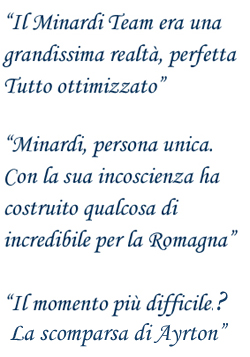 “Ho conosciuto Minardi fin da ragazzo, seguendo le gare di mio zio Giancarlo in Formula Italia e Formula 2. Nel 1983, proprio con Gian Carlo, conquistai il secondo posto a Misano al volante della Minardi-BMW F2, dopo aver conquistato anche il titolo nella Formula 3. Per il suo debutto in Formula 1 nel 1985 mi volle con lui” ricorda Pierluigi Martini ai microfoni di www.Minardi.it “Fu un’esperienza tanto difficile quanto importante poiché, essendo l’unico pilota, tutte le responsabilità erano sulle mie spalle. Stagione comunque positiva poiché al debutto assoluto conquistammo l’ottavo posto in Australia. Col punteggio di oggi ci avrebbe consegnato i primi punti mondiali. A fine stagione le nostre strade si divisero. Tornai in F.3000 dove nel 1986 conquistai il secondo posto nel Mondiale Intercontinentale, e con grande piacere, Gian Carlo mi richiamò al suo fianco nel 1988 in occasione del gran premio di Detroit, ripagando la sua fiducia col primo punto mondiale grazie al sesto posto. Iniziò un bellissimo rapporto che durò fino al mio ritiro dalla F1 nel 1995, con la sola parentesi del ’92 con la Scuderia Italia. Dopo una pausa è arrivata la vittoria alla 24 Ore di Le Mans con la BMW nel 1999″